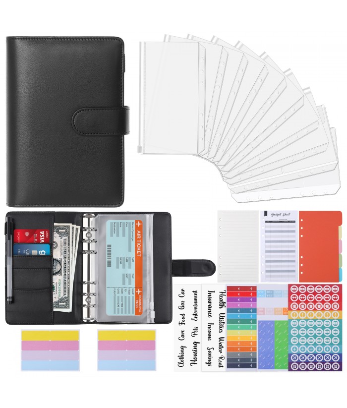 Revspoir Ring Binder 80-in-1 Set, Leather Notebook Budget Binder for Budget Money, with Clear Cash Envelopes, Budget Sheets and Label Stickers, Cash Organizer, Ideal for Travel or Work (Black)